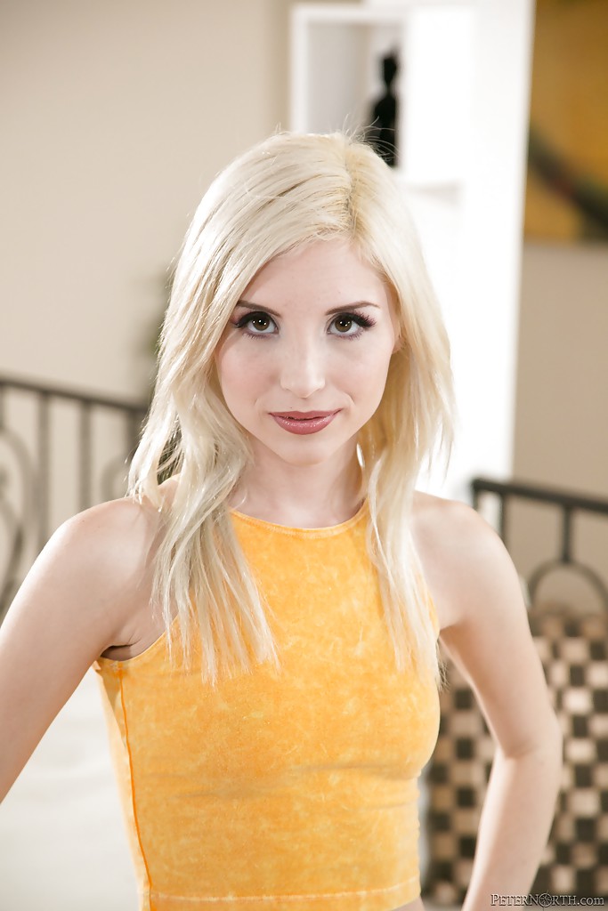 Белокурая красотка Пайпер Перри обнажает крошечные сиськи молодой порнозвезды в гольфах до колен