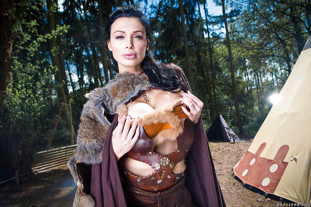 Брюнетка Алетта Оушен освобождает массивные сиськи от костюма для косплея на открытом воздухе