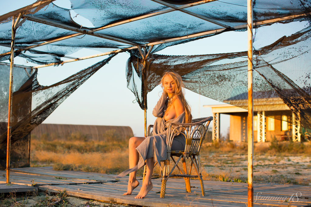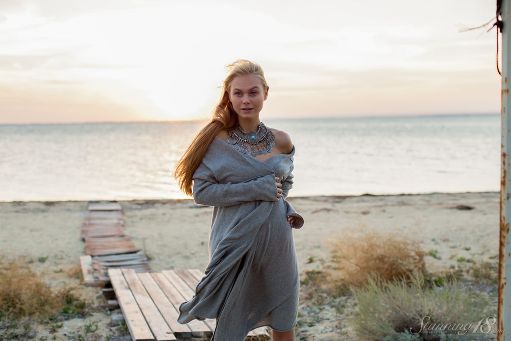 Едва законнорожденная блондинка Нэнси А полностью раздевается у океана