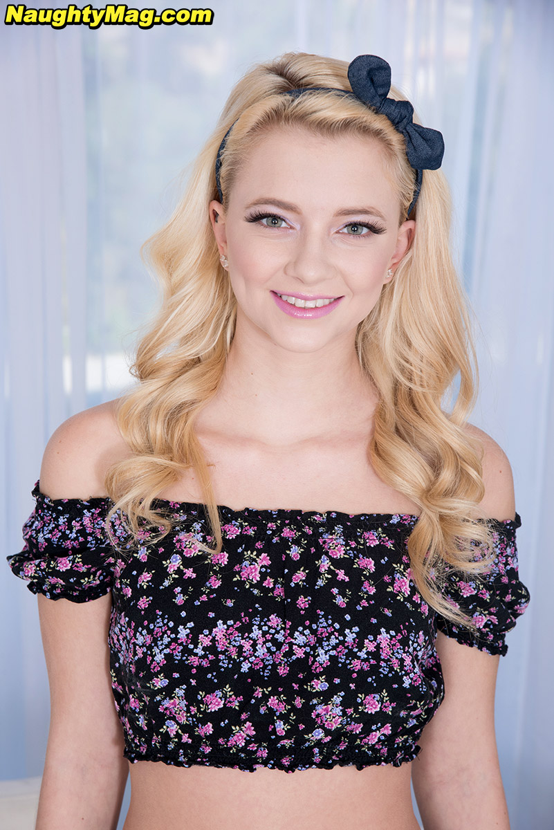 Худенькая блондинка Райли Стар обнажает свои маленькие сиськи перед тем, как отсосать член