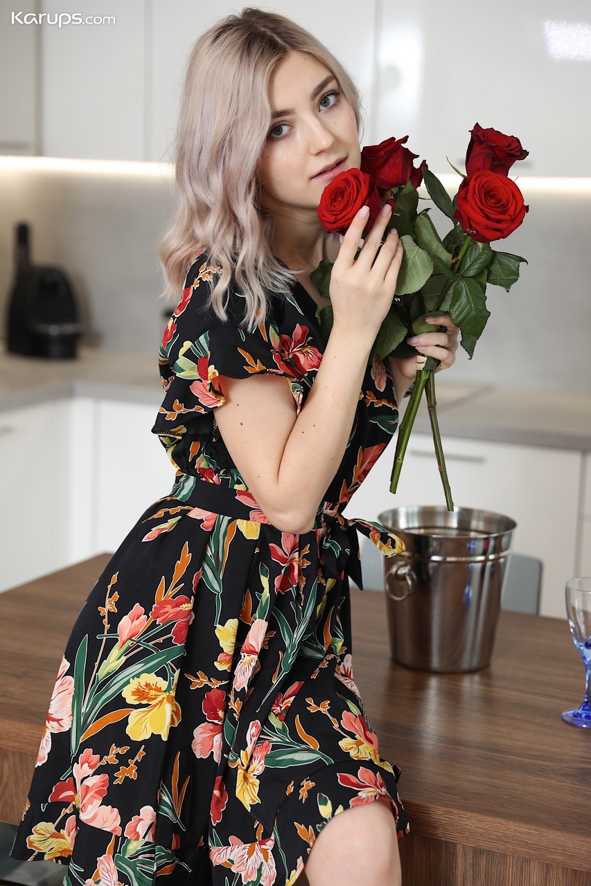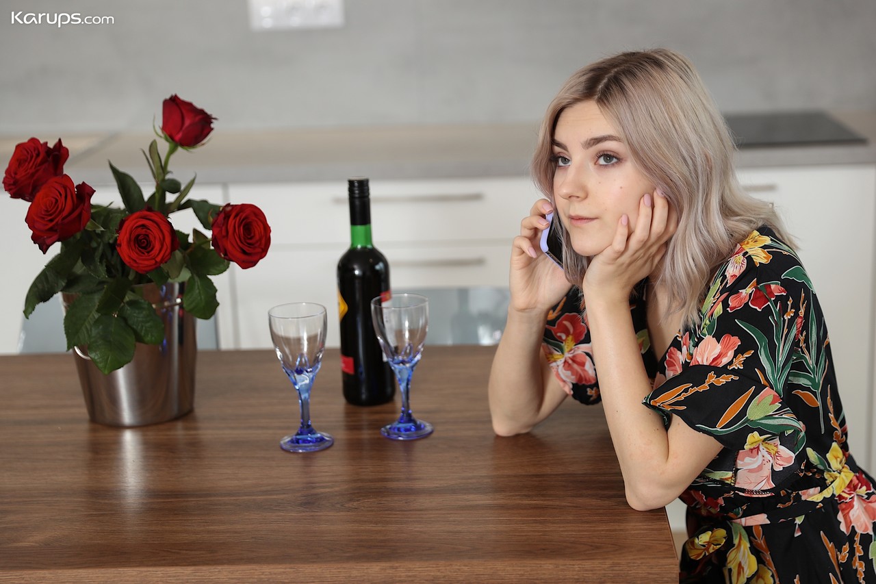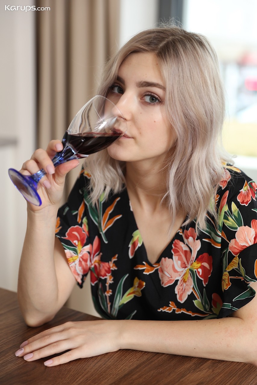Любительская девушка Ева Элфи полностью раздевается после того, как выпила вина за кухонным столом