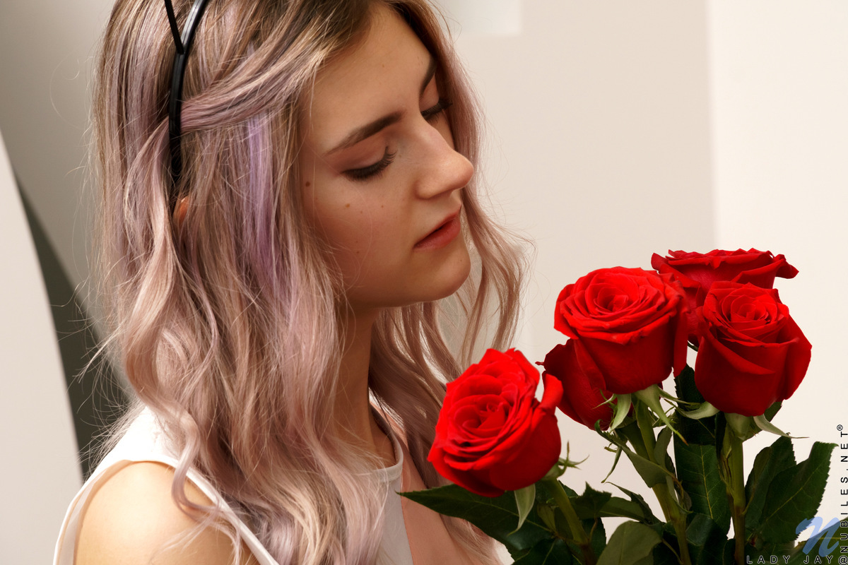 Молодая соло-девушка Леди Джей показывает свою розовую пизду в белых гольфах до колен