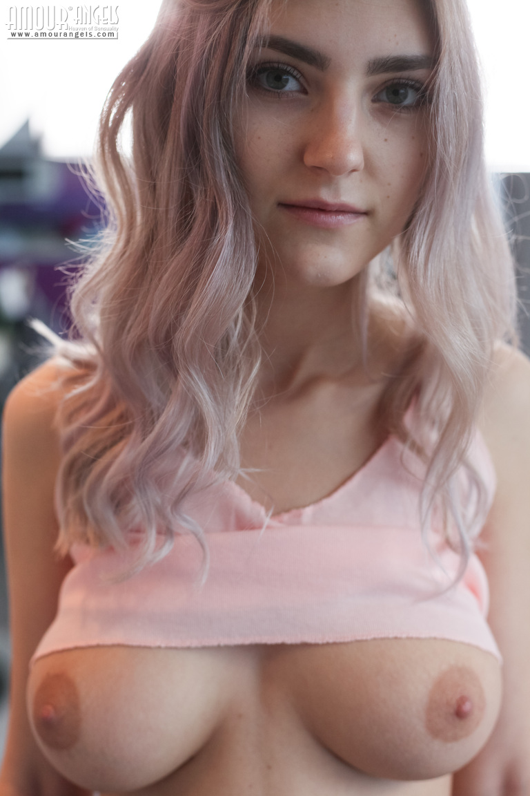 Молоденькая первокурсница обнажает гигантские сиськи, раздеваясь до розовых гольфов
