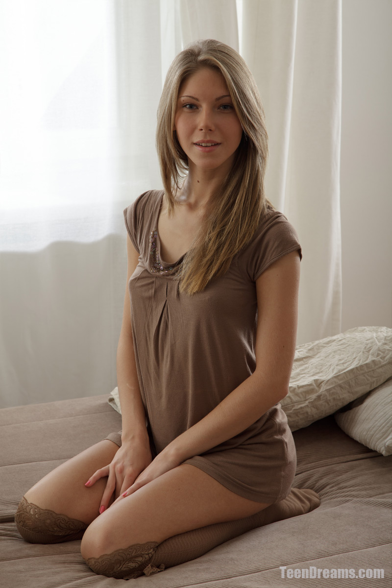 Неопытная девушка в гольфах до колен демонстрирует свое худенькое тело в обнаженном виде