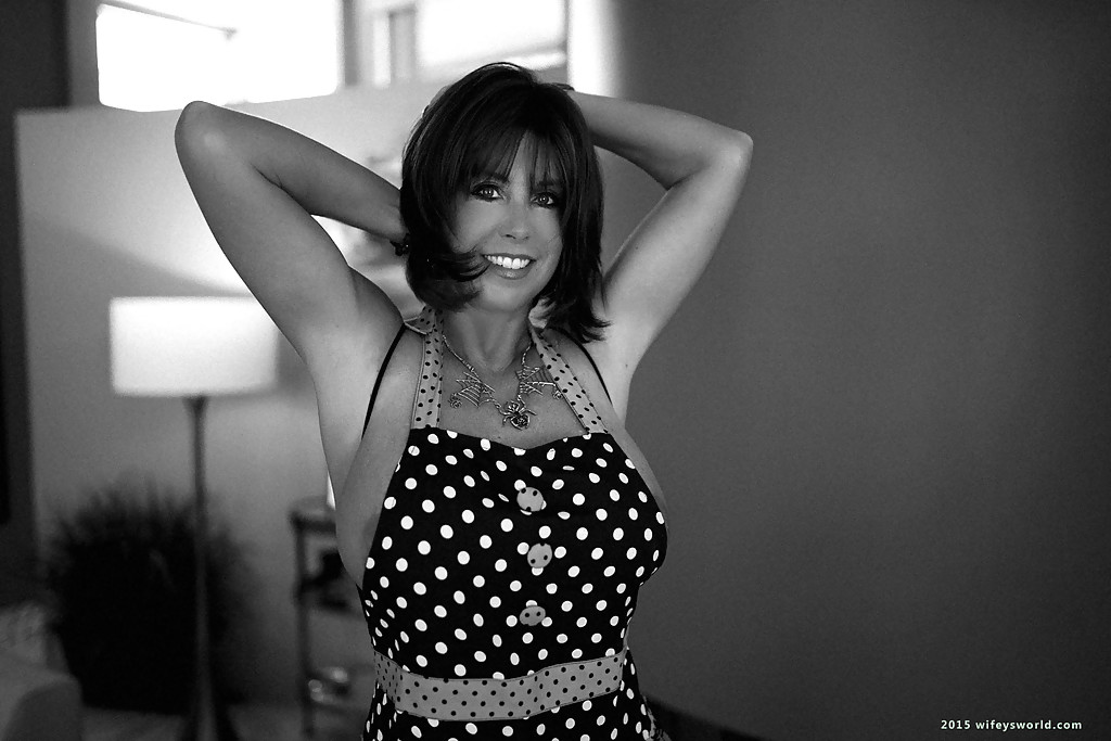 Пышногрудая домохозяйка Сандра Оттерсон моделирует сексуальное бодистокинг с открытой промежностью