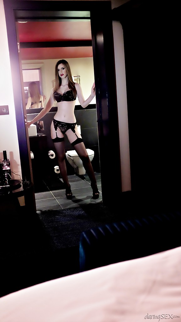 Полностью натуральная красотка в чулках Стелла Кокс позирует в гостиничном номере