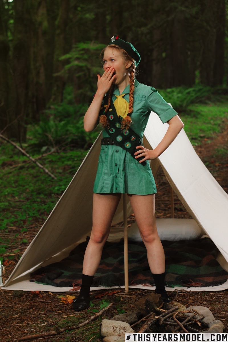 Рыжеволосая девочка-скаут Долли Литтл раздевается перед своей палаткой в берете