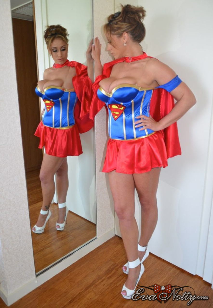 Сексуальная милфа Ева Нотти брызгает спермой на свои сиськи, снимая костюм Супермена
