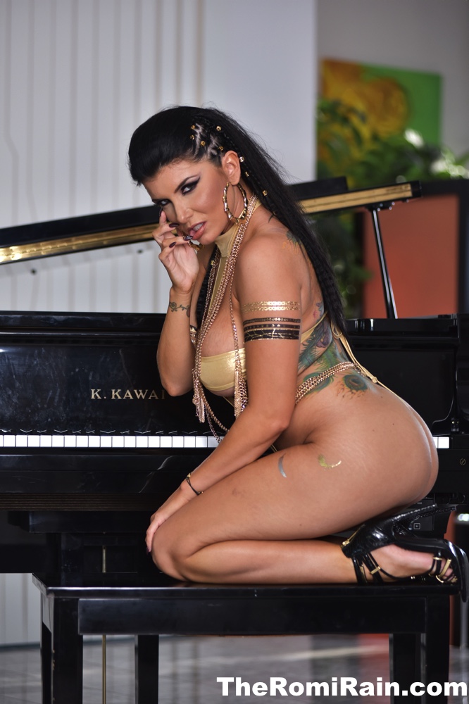 Сексуальная милфа Роми Рейн обнажает свои большие сиськи и киску на скамейке у пианино