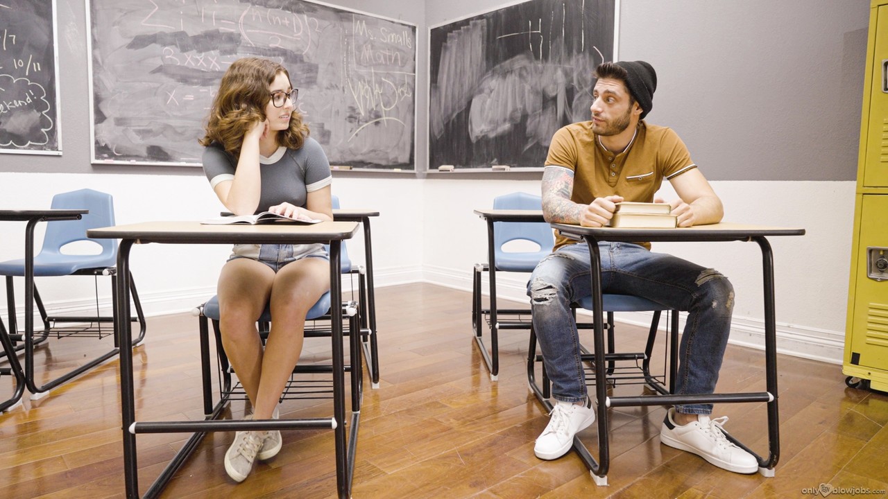 Симпатичная молодая девушка надевает очки, делая минет топлесс в классе