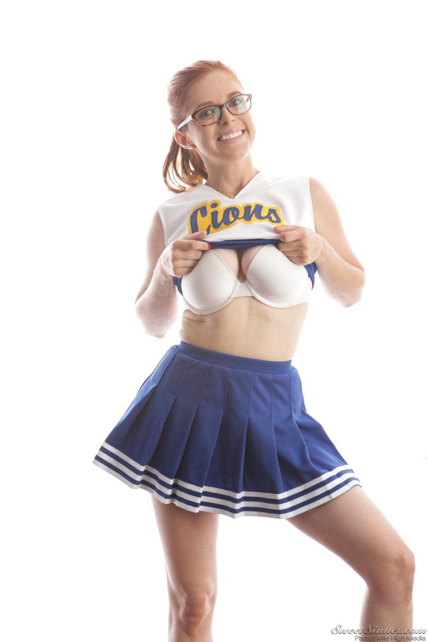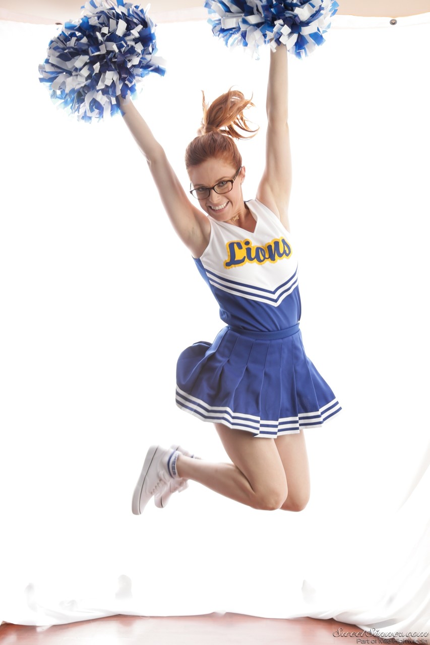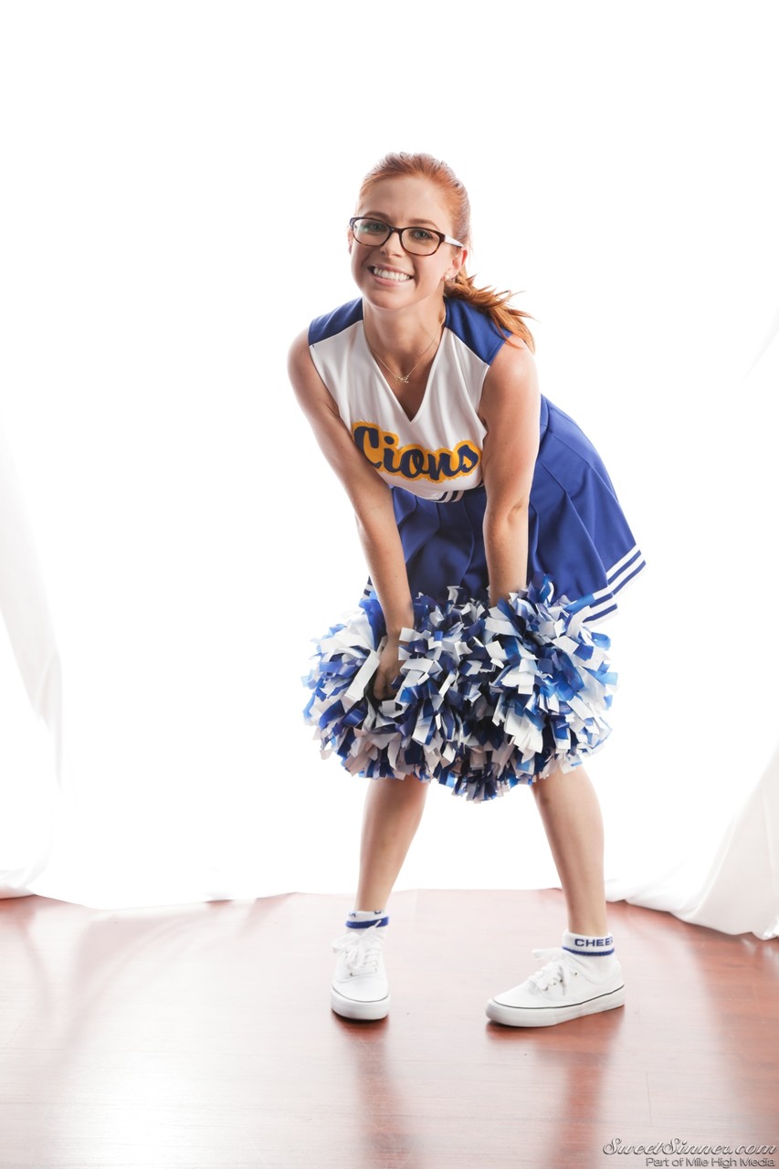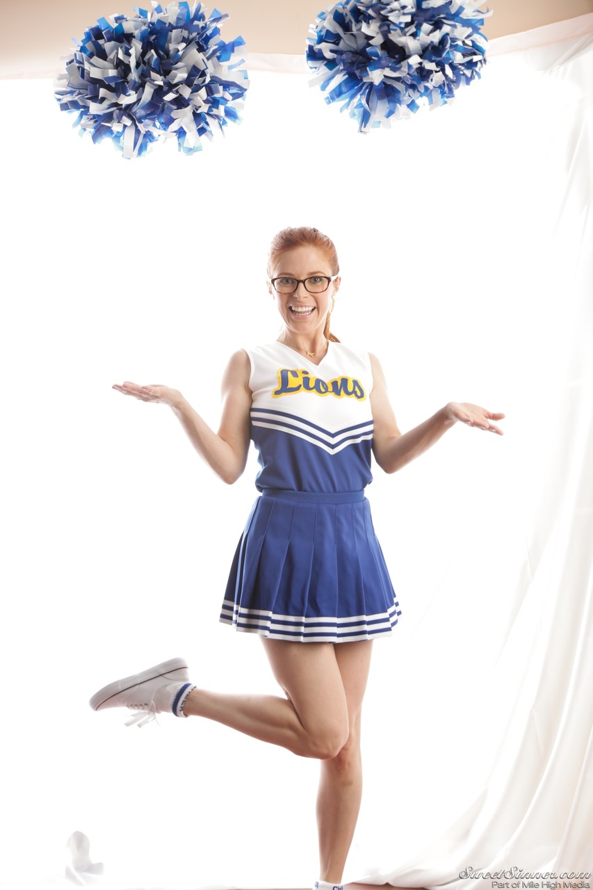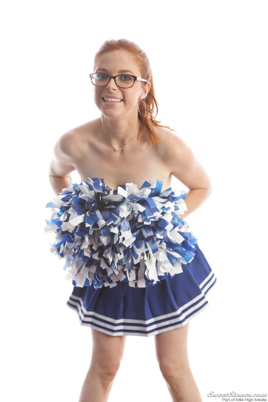 Симпатичная рыжеволосая болельщица Пенни Пакс в очках обнажает большие сиськи и упругую попку