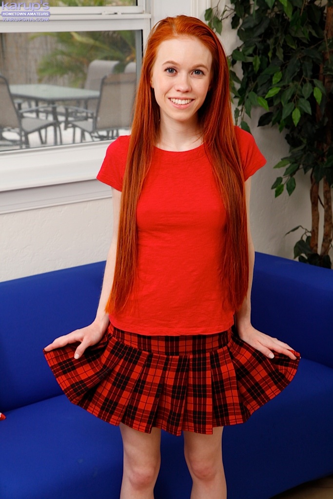 Симпатичная рыжеволосая Долли Спайс снимает свою клетчатую юбку и трусики, чтобы позировать обнаженной