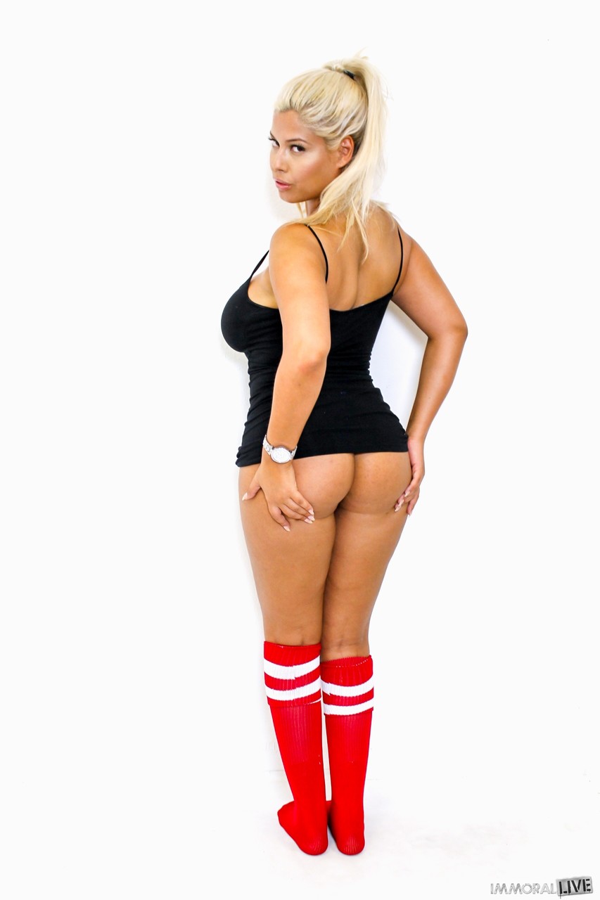 Соло-модель Бриджит Би освобождает свои ягодицы от короткого платья в гольфах до колен