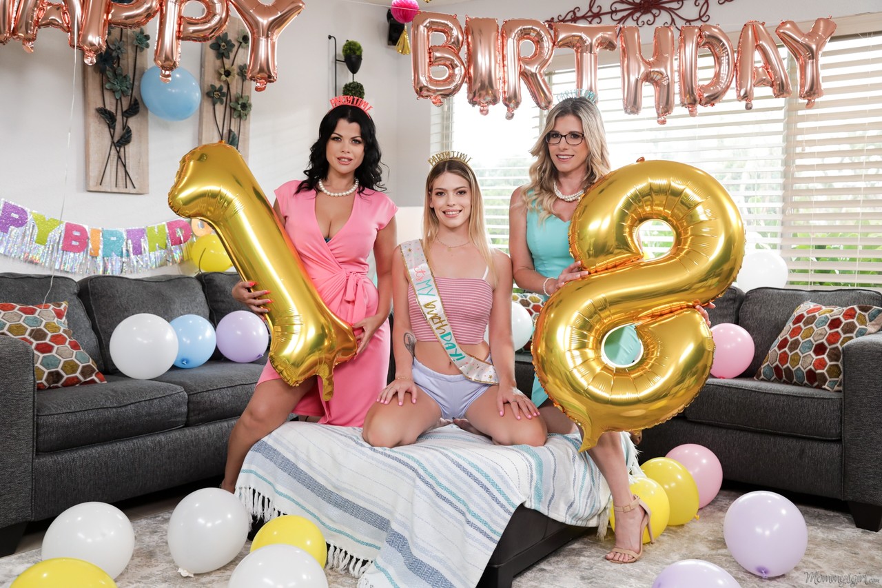 Три женщины празднуют день рождения лесбийским сексом втроем на фоне