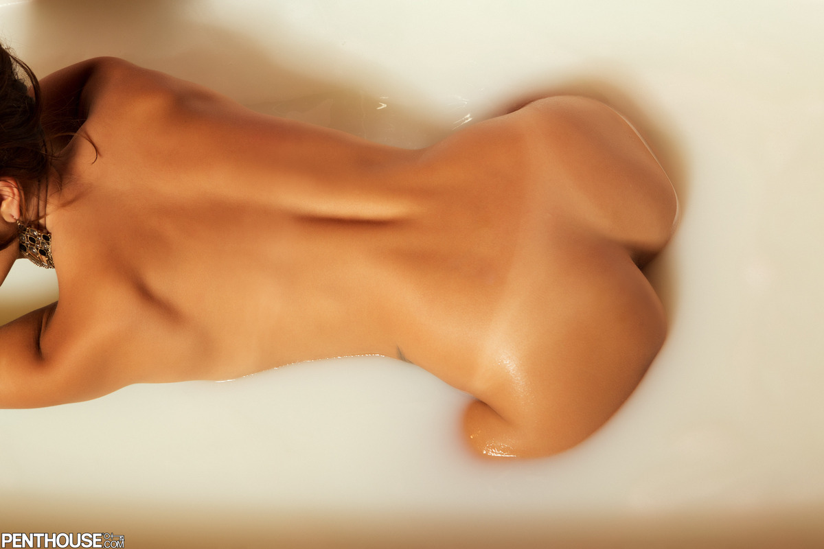 Великолепная девушка Ариана Мари раздевается в ванне, наполненной молоком и лепестками роз