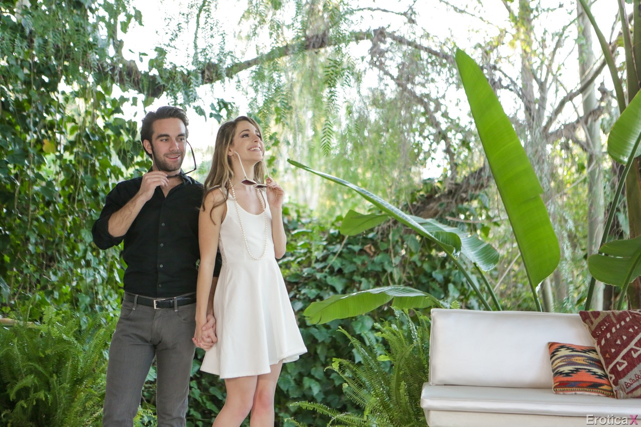 Великолепная Кимми Грейнджер голышом сосет твердый член своего парня в бассейне на улице