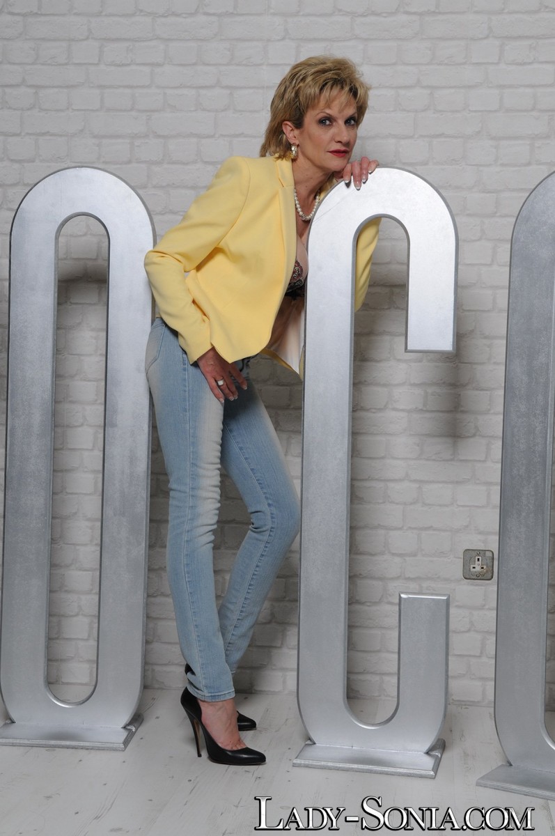 Зрелая британка леди Соня обнажает свои большие сиськи, прежде чем стянуть джинсы