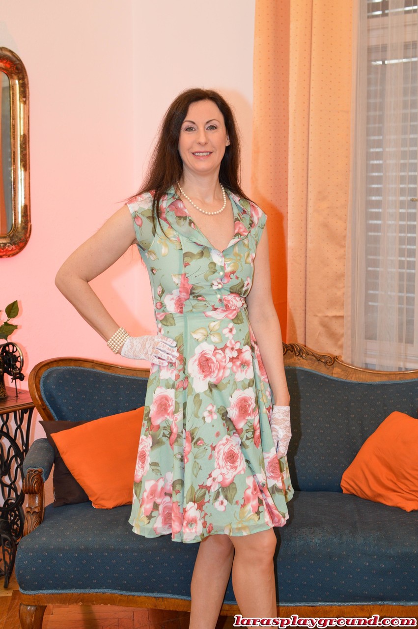 Зрелая любительница Лара Латекс надевает кружевные перчатки, чтобы потрогать пальцами свою возбужденную киску